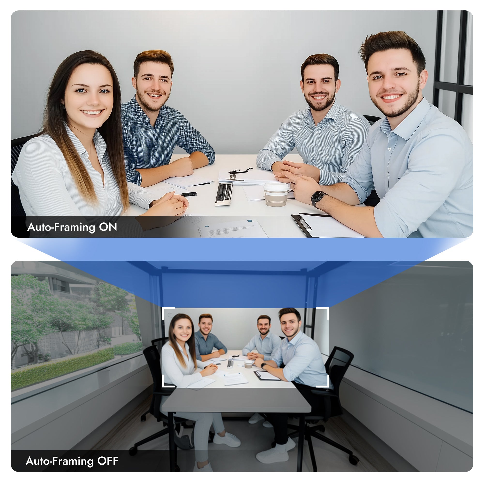 De functie voor automatische framing detecteert het aantal deelnemers en hun bewegingen. Het past de camera automatisch aan om het best mogelijke beeld vast te leggen, waardoor de efficiëntie van de vergadering wordt verbeterd door iedereen in beeld te houden.