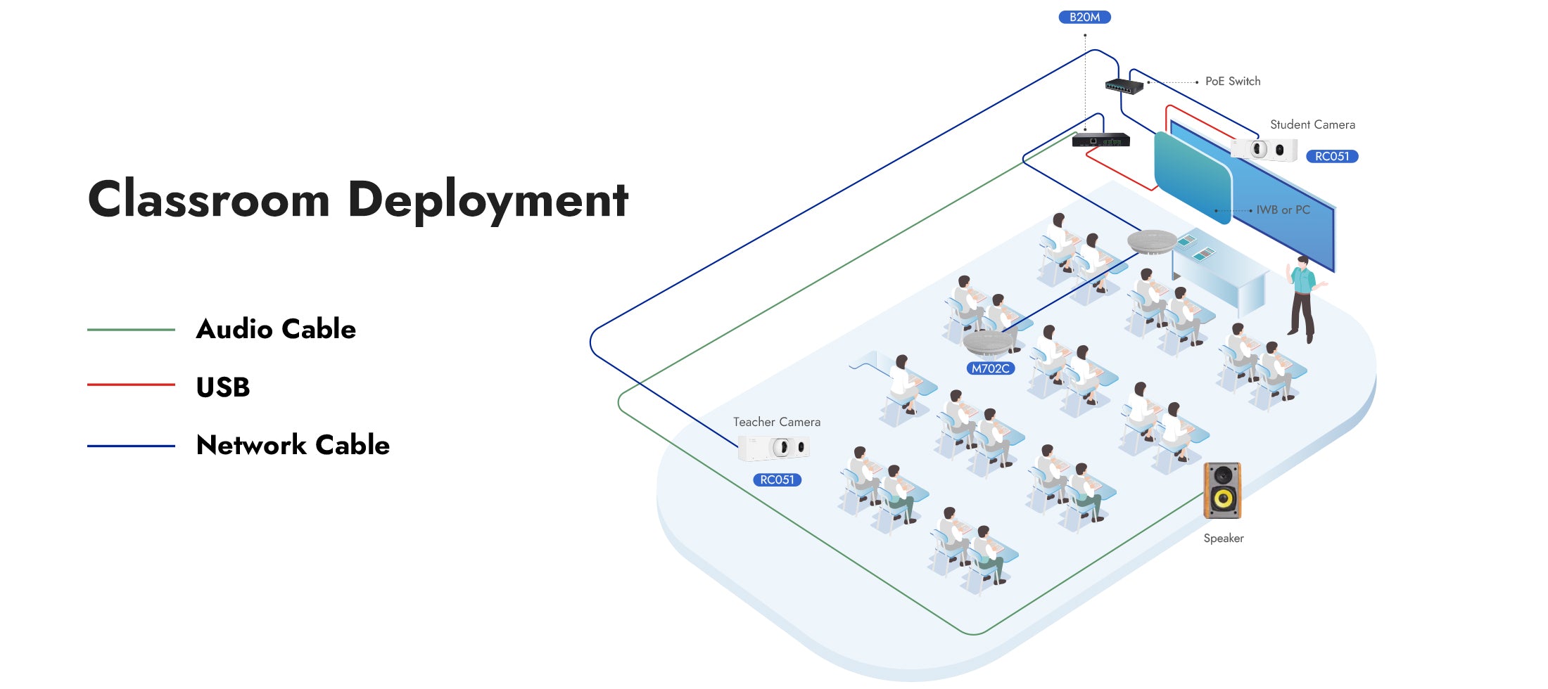 Integrated AI and microphone technology, when paired with the RM702C, ensure voice clarity is always at its best. The beamforming algorithms and 3A audio processing reduce classroom noise, keeping audio crisp and clear whether you're addressing the whole class or engaging one-on-one. Plus, it supports PoE for Ethernet cascade deployment, connecting up to 6 devices for flexible installations.